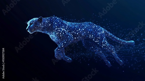 Obraz premium Low poly cheetah in motion. With dark blue background. Low poly wireframe with lines, dots and glowing particles