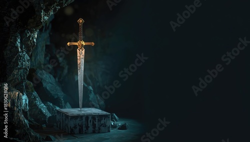 © Giovanni, Naklejka premium Low-poly heroic sword suspended in a mystical cave, emphasizing fantasy weapon maintenance, explorer's booty, No specific holiday