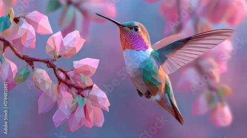 © weerasak, Fototapeta premium Low poly hummingbird hovering near pink abstract flower, vibrant geometric art, soft pastel background, peaceful mood