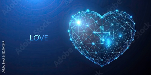 Fototapeta premium Low Poly Wireframe Heart with Addition Symbol on Dark Blue Background, Isolated Design for Love, Growth, and Positivity with Clean Copy Space for Creative Use
