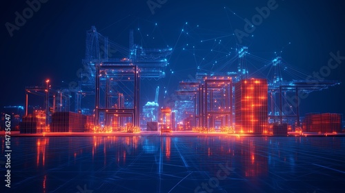 Naklejka premium Low Poly Wireframe Port Storage Facility with Detailed Cargo Containers, Cranes, and Shipping Docks, on Dark Blue Background, Highlighting Global Logistics and Trade in a Modern Digital Environment