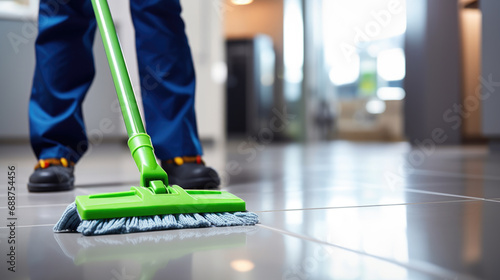 © Studio Nova, Fototapeta premium Low section of a person cleaning floor with wet mop at home.