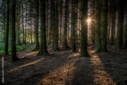 Obraz premium Low sun, sunset, in pine wood, forest. Devon, UK.