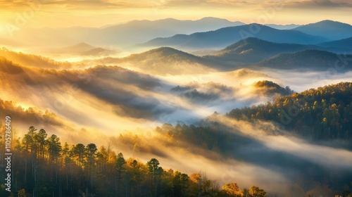 Fototapeta premium Low sunlight breaking through fog over a mountain ridge, casting golden light across misty peaks and valleys