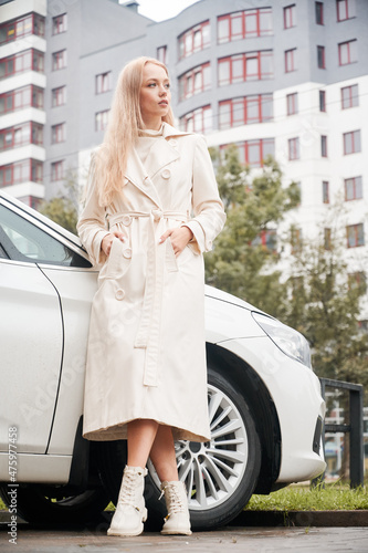 © anatoliy_gleb, Fototapeta premium Low view of blonde girl in white coat leaning against her modern car outdoors on backdrop of tree and high-rise building. Lady standing near auto and looking to the right, waiting for passenger.