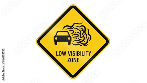 Obraz premium Low visibility zone warning sign with car in fog or smoke