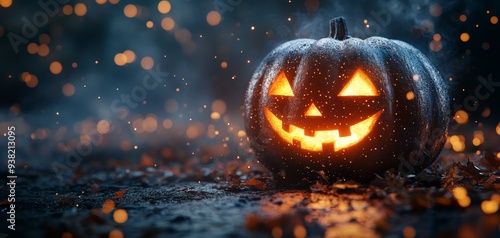 © Amara, Fototapeta premium LowAngle View of a Glowing JackoLantern in a Mystical Forest Setting with Smoke and Bokeh Lights