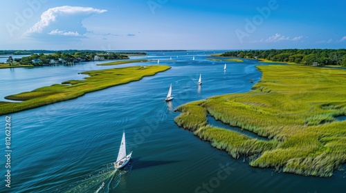 Fototapeta premium Lowcountry Marsh Scenery in Charleston, South Carolina: Sailboats Crossing Blue Tidal Cooper River