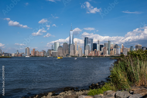 © Studio 30fps, Fototapeta premium Lower Manhattan skyline with boat and ferry on Hudson river view from Liberty State Park in late summer