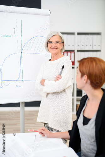 Fototapeta premium ältere lächelnde geschäftsfrau erklärt etwas am flipchart