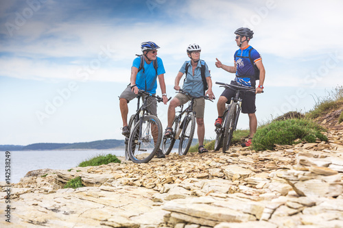 © mmphoto, Fototapeta premium Älteres Pärchen auf Radtour am Meer mit jungem Bikeguide