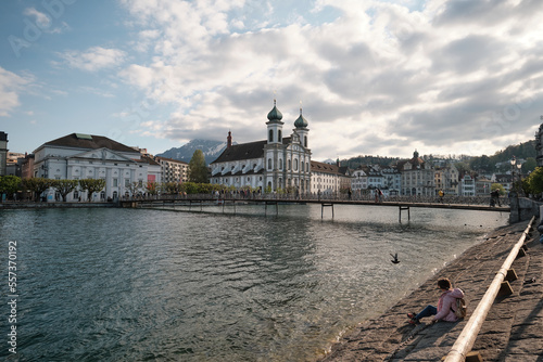 Obraz premium Lucerna, il fiume Reuss, la chiesa dei Gesuiti.