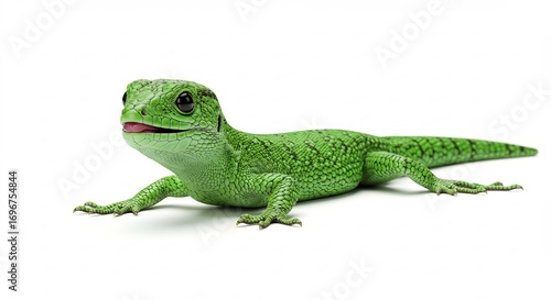 © Maria, Obraz premium Lucertola verde brillante posa su sfondo bianco luce naturale. AI Generated