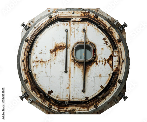 © Gustav, Naklejka premium Lucid Realism, A Heavily Damaged Space Capsule Door Reveals the Harsh Realities of Space Exploration and its Aftermath