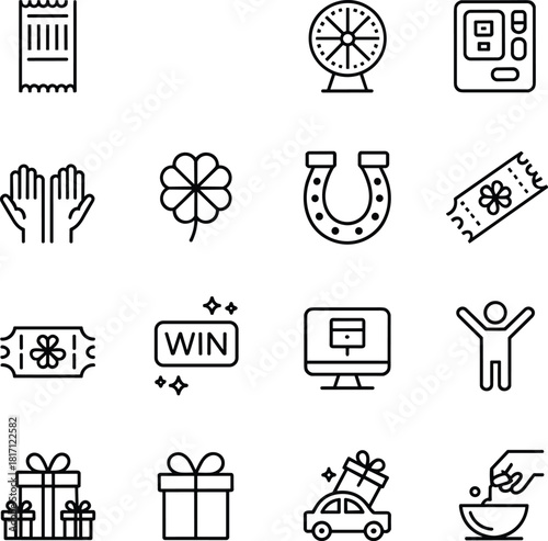 © Md, Naklejka premium Luck icons, winning symbols, reward, ticket, gift, clover, horseshoe, celebration, spin wheel, coupon, car, hands, bowl, monitor, voucher, raffle, sparkle, joy, prize, fortune, giveaway