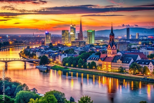 © prapatsorn, Fototapeta premium Ludwigshafen Germany Skyline at Dusk - Bokeh Lights, Cityscape Panorama