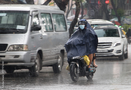 © milkovasa, Fototapeta premium Ludzie w płaszczu przeciwdeszczowym jeżdżą na motocyklu w deszczu. Transport w mieście podczas deszczu.