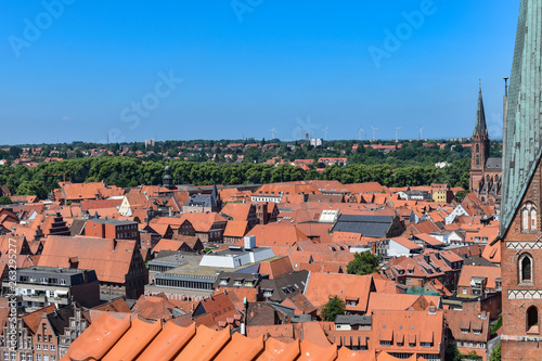 © Mickis Fotowelt, Fototapeta premium Lueneburg, Germany - June 5, 2018: View from the old water tower of the historic Hanseatic city of Lueneburg, Germany, over the rooftops of the old town.