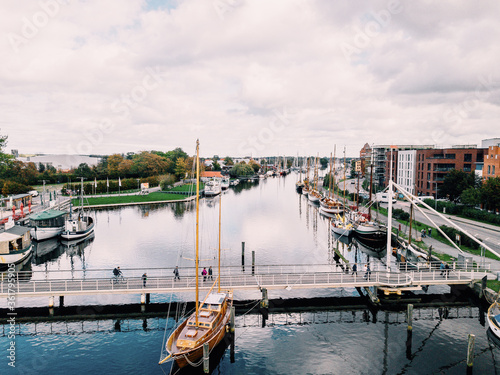 Obraz premium Luftbild von Greifswald und dem Ryck mit Museumshafen