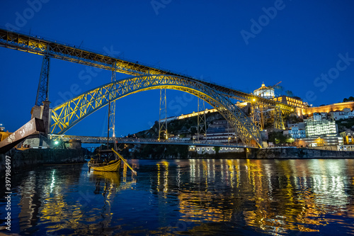 © Jason Row Photo, Obraz premium Luis I Bridge during evening twilight in Porto, Portugal.