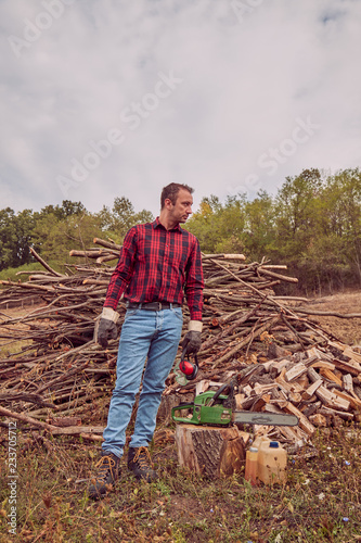 Fototapeta premium Lumberjack with chainsaw and pile of cut woods.