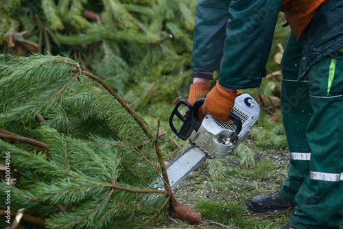 Naklejka premium Lumberman hands cutting branches of pines, used Christmas tree, with the...