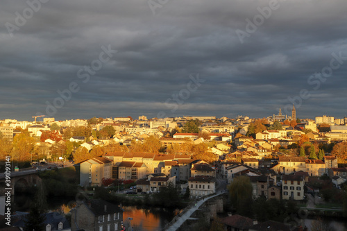 © natgi, Naklejka premium Lumière matinale sur la ville juste avant la pluie