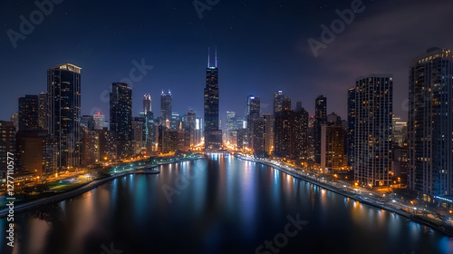 Fototapeta premium Luminescent Cityscape: Embracing the Night's Tranquil Charm with Urban...