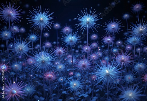 © Mehdi, Naklejka premium Luminescent Garden, Dreamlike Blooms... Glowing Flowers With Spiky Petals Radiate Soft Light In Cool Blue And Purple Hues, Creating An Abstract Arrangement For Visual Intrigue.