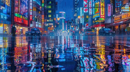 © Shodaime, Obraz premium Luminescent neon lights reflecting in rain-soaked city streets at dusk