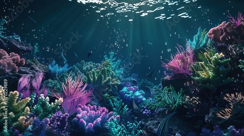 Fototapeta premium Luminescent Wonders: A Neon Coral Reef Under Moonlight, Where Bioluminescent Life Dances in the Deep