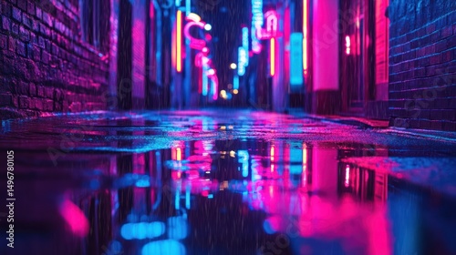 Obraz premium Luminous alleyway scene with vibrant neon colors reflecting in rainwater