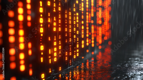 © transparan, Naklejka premium Luminous Binary Code Wall In Rain