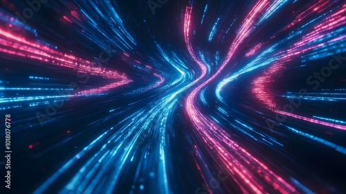 © plaksa, Obraz premium Luminous blue lines speed. Neon color glowing lines background, high-speed light trails effect. Futuristic dynamic motion technology.