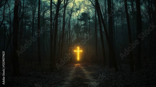 Obraz premium Luminous Cross in a Dark Forest