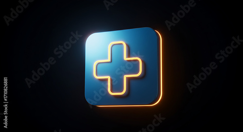 © mushtaq, Fototapeta premium Luminous 3D plus sign in a blue square with a glowing orange neon outline on a dark background.