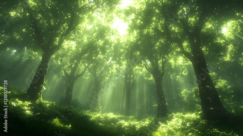 Fototapeta premium Luminous Forest: A Dreamlike Scene of Sunlight Filtering Through Lush Green...