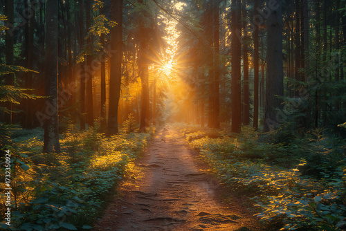 © vishnu, Fototapeta premium Luminous Forest Pathway with Dappled Light, Vibrant Foliage, and Nature Sounds in a Serene Sunny Setting
