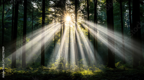 © siraphol, Obraz premium Luminous forest with sunlight streaming through trees, creating serene atmosphere