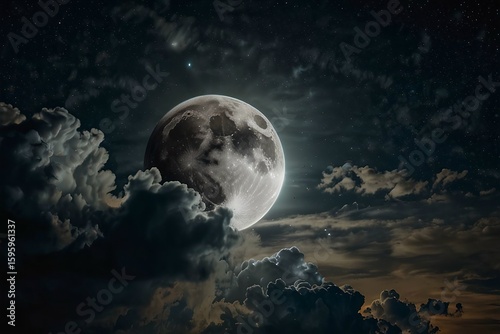 Fototapeta premium Luminous Full Moon Peeking Through Dramatic Night Clouds with Scattered Stars