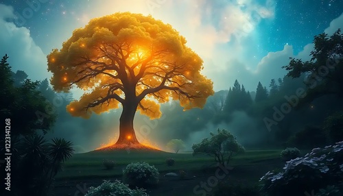Fototapeta premium Luminous Golden Tree in a Mystical Forest Night