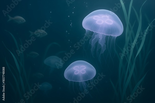 Fototapeta premium Luminous jellyfish and schools of fish gracefully navigate a dark underwater...