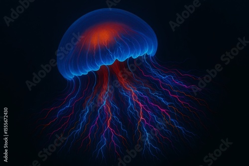 © BushCost, Fototapeta premium Luminous jellyfish floating in the dark deep ocean with colorful tentacles
