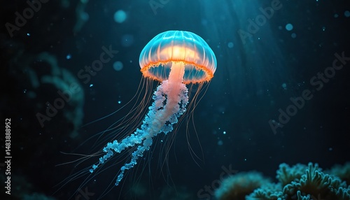 © Vadym, Naklejka premium Luminous jellyfish floats underwater, vibrant, against dark background. Marine life nature theme with bioluminescent creature, underwater scenery, fantasy illustration. Mystical, magical ocean design.