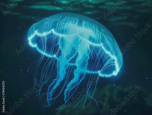 Fototapeta premium Luminous Jellyfish Glowing Gently in Deep Ocean Depths - Enchanting Marine...