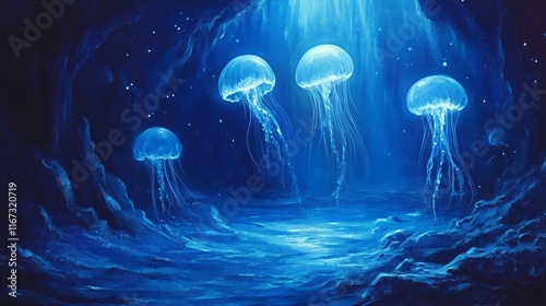 Fototapeta premium Luminous Jellyfish Illuminate Dark Underwater Cave
