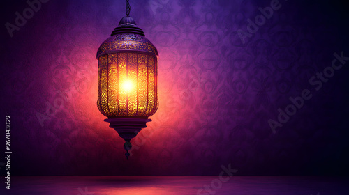© iPhoto, Obraz premium Luminous lantern on purple background with copy space.