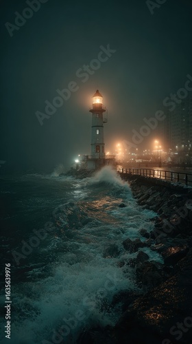 © Andayani, Fototapeta premium Luminous lighthouse, stormy night