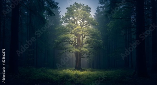 Naklejka premium Luminous oak tree stands tall in a misty, dark forest, illuminated by an...