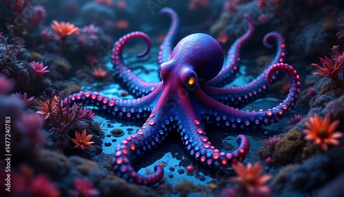 © avissarahmanita, Obraz premium Luminous Octopus with Red Accents in a Vibrant Coral Reef Setting Close Up